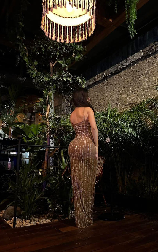 VESTIDO MAXI TIRANTES CAFE CRISTALES