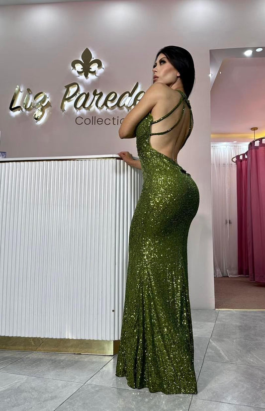 VESTIDO MAXI LENTEJUELA VERDE OLIVO
